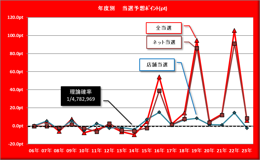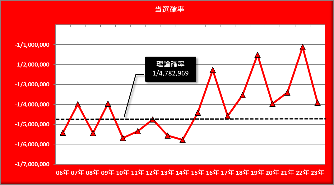 「大数の法則」により年度毎(シーズン毎)の当選確率の平均は年度(シーズン)を重ねる程理論確率は1/480万に近づく。