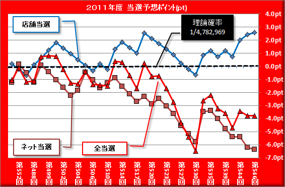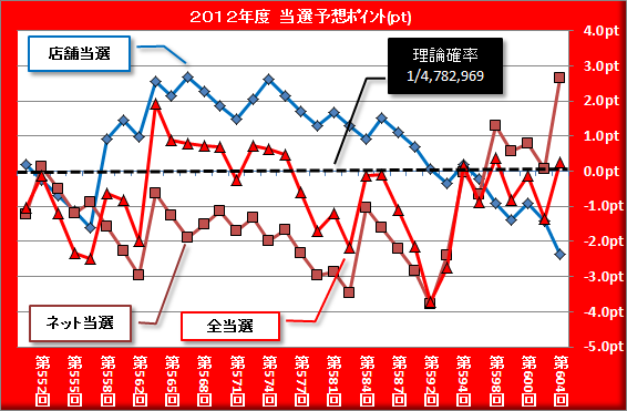 2012年の販売口数は194,866,351口、当選口数は41口、理論当選数は40.7でやや当たり過ぎの傾向です。