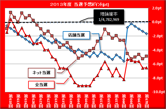 2013年の販売口数は222,603,366口、当選口数は40口、理論当選数は45.6でやや外れ過ぎの傾向です。 第662回は1等当選金10億の特別開催回で1等は9口発生している。