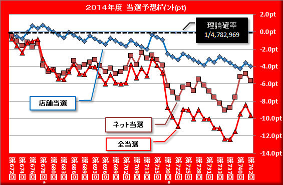 2014年の販売口数は265,928,804口、当選口数は46口、理論当選数は55.6で外れ過ぎの傾向です。 第678回は1等当選金10億の特別開催回で1等は3口発生して、第720回は1口発生している。