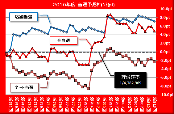 2015年の販売口数は268,707,792口、当選口数は61口、理論当選数は56.2で当たり過ぎの傾向です。 1等当選金10億の特別開催回は、第745回で6口、第775回で2口、第806回で6口1等が発生している。