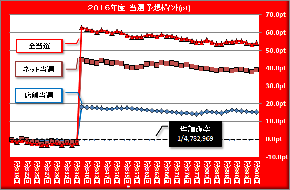 2016年の販売口数は232,893,079口、当選口数は103口、理論当選数は48.7です。 第838回(熊本震災)では開催されない試合は当たりとして扱い、1等当選が66口発生しました。 よって、他年度と比較するのは困難な数値となっています。