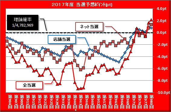 2017年の販売口数は233,625,934口、当選口数は51口、理論当選数は48.8です。 第940回1等当選10億の特別開催では1等が未当選であった。